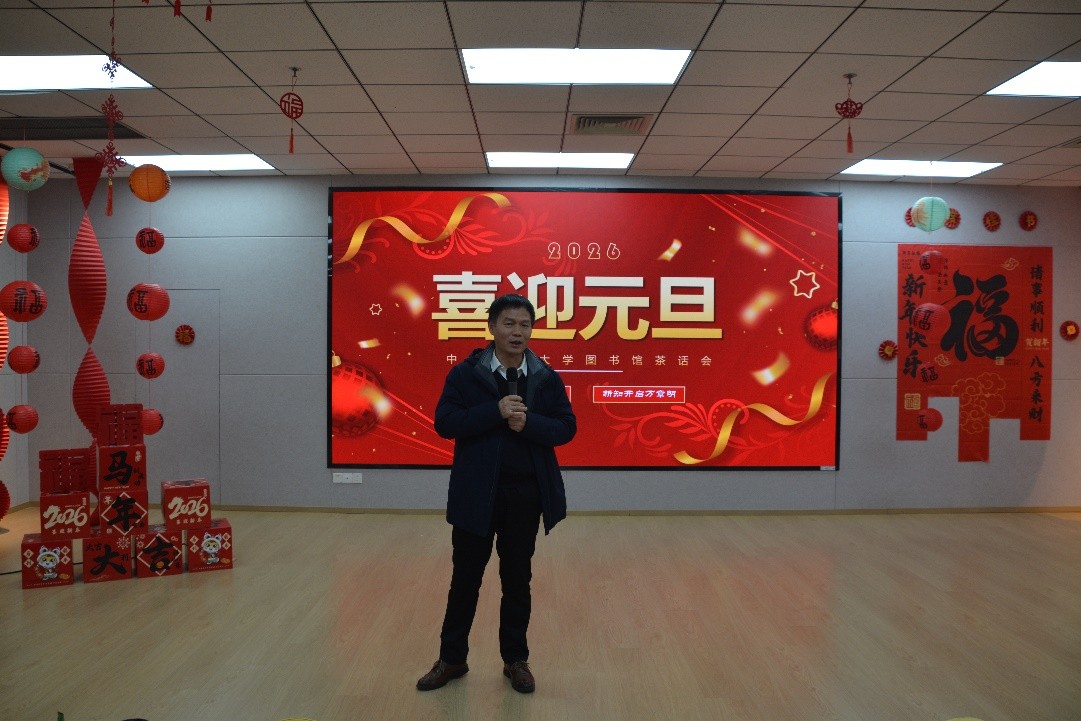 茶话会伊始,图书馆馆长王新宇发表了热情洋溢的新年致辞。他首先代表馆领导班子向全体馆员致以诚挚的新年祝福,对大家在2025年的辛勤付出与卓越贡献表示衷心的感谢。致辞中,馆长回顾了过去一年图书馆在文献资源建设、读者服务优化、文化活动开展、队伍建设提升等方面取得的丰硕成果,同时也对2026年的工作进行了展望,鼓励全体馆员继续秉持“读者第一、服务至上”的理念,以更饱满的热情、更务实的作风,推动图书馆事业高质量发展,为广大读者提供更优质、更便捷的文化服务。