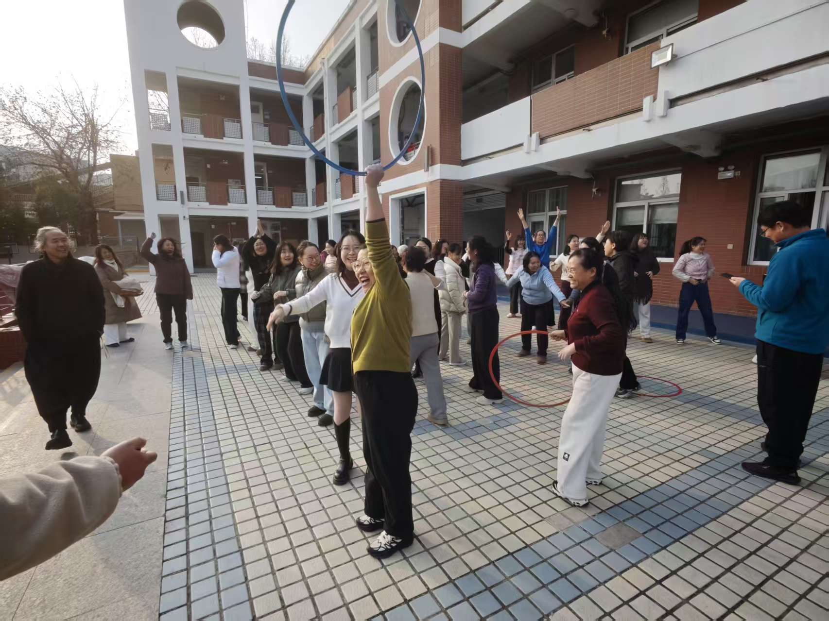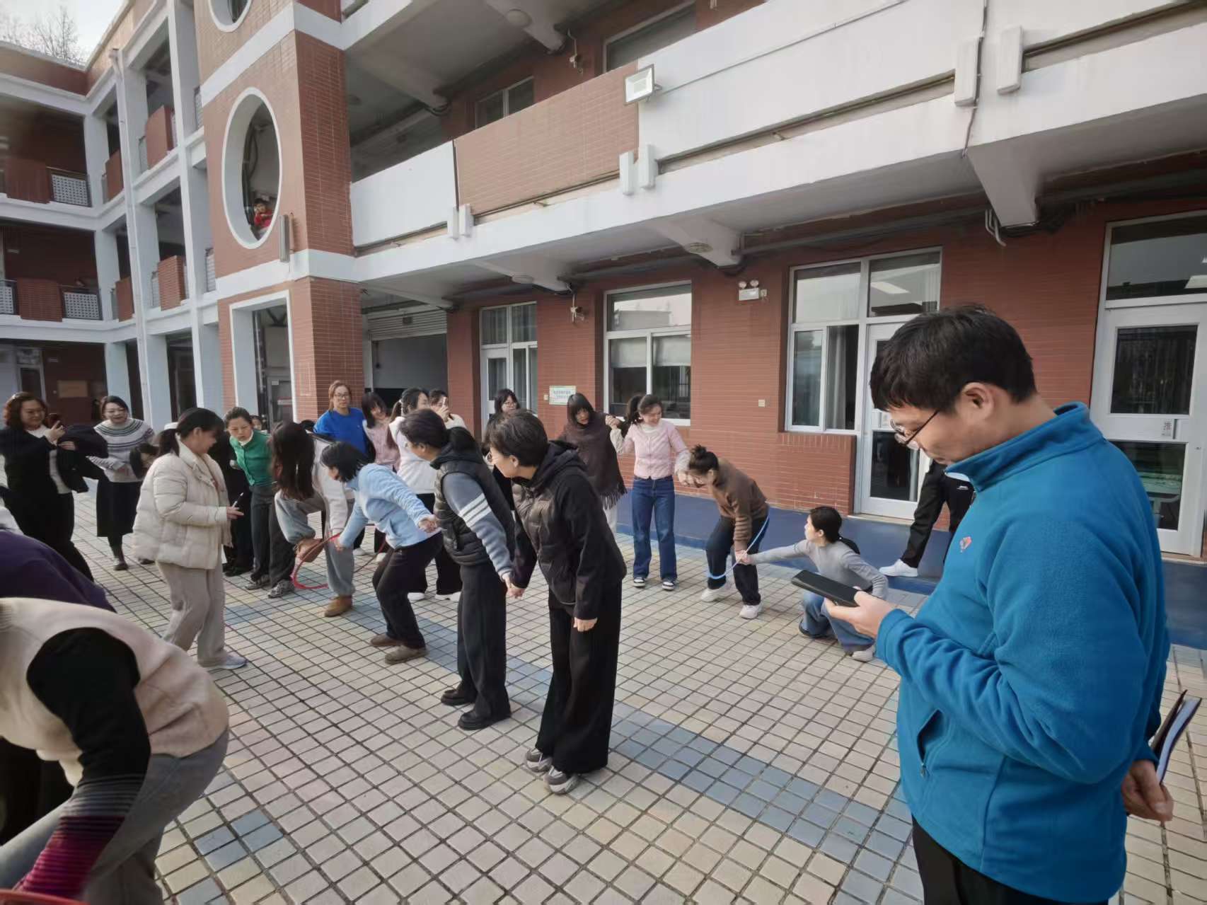 周五下午四点,附属小学全体女教师在附小一楼大平台举行一场别开生面的“一圈到底”接力赛活动。活动分四个小组,每组8人,每组另外选裁判和计时人员各一名。计时排名,评选一二三四等奖。大家在手拉手、心连心的协作中,增进了彼此的信任与默契。小小的胶圈,传递的是团结,凝聚的是力量。大家配合默契,在欢声笑语中结束比赛,最终高年级组以60秒57的好成绩获胜。