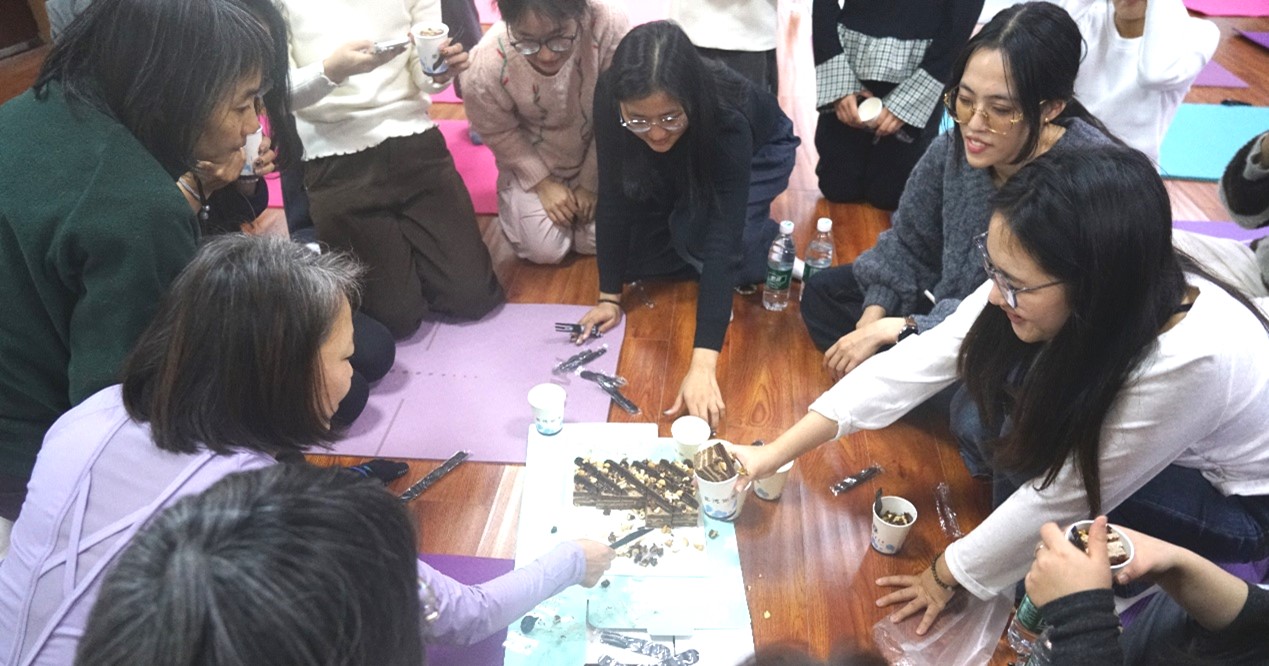读书分享环节,师生在冬阳美拍角前自由合影,定格初见美好。通过“共读手卡”的填写与随机匹配,让陌生的师生快速结对,为后续交流搭建起温馨桥梁瑜伽环节,教练带领大家开展冬日舒缓瑜伽训练,聚焦肩颈放松与核心保暖的拉伸体式。“师生互助”环节,教师与学生结对,互相指导动作、纠正姿态,瑜伽室里充满温暖与默契。冥想静心环节,师生们闭上双眼,感受身边伙伴的呼吸节奏,感恩暖阳下的相遇与陪伴。大家轻声交流,一句句暖心话语让情感共鸣再度升温。师生围坐共品冬日限定暖饮和茶点。