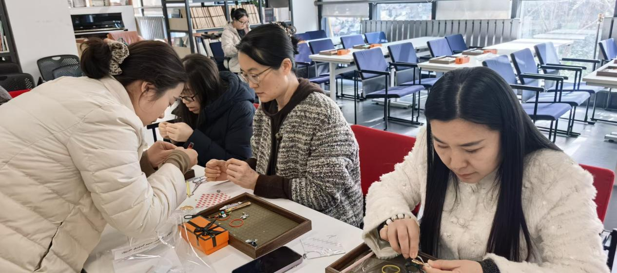 为庆祝 “三八” 国际妇女节,丰富学院女教职工精神文化生活,感受传统工艺之美,建筑与设计学院工会妇委会于2026年3月13日下午,在学院资料室精心组织开展非遗手工体验活动。学院女教职工们欢聚一堂,沉浸式制作宋锦挂件与点翠饰品,在指尖创作中欢度美好节日。