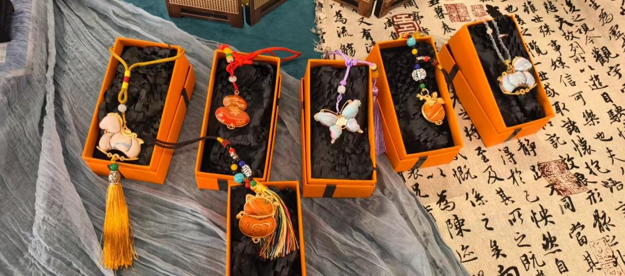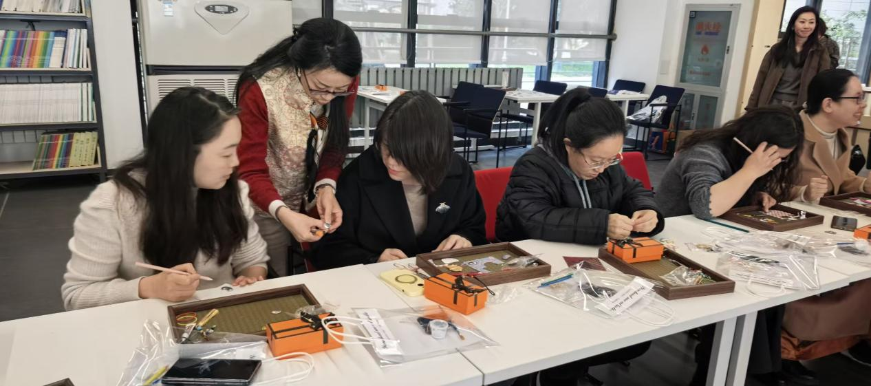 活动现场氛围温馨热烈,工作人员提前备好宋锦面料、金属底托、翠羽纹样贴片等制作材料与工具,并细致讲解宋锦挂件的拼接技巧、点翠饰品的组装要点,从纹样搭配到细节固定,耐心解答大家的疑问。女教职工们兴致盎然、热情高涨,纷纷动手实践,精心拼接、细致粘贴,将巧思与匠心融入每一个步骤。大家相互交流制作心得,分享创作灵感,在一刷一剪、一贴一粘间,感受宋锦的细腻雅致与点翠工艺的古典韵味,原本普通的材料,在大家的手中逐渐变成一件件精致独特的手工作品。